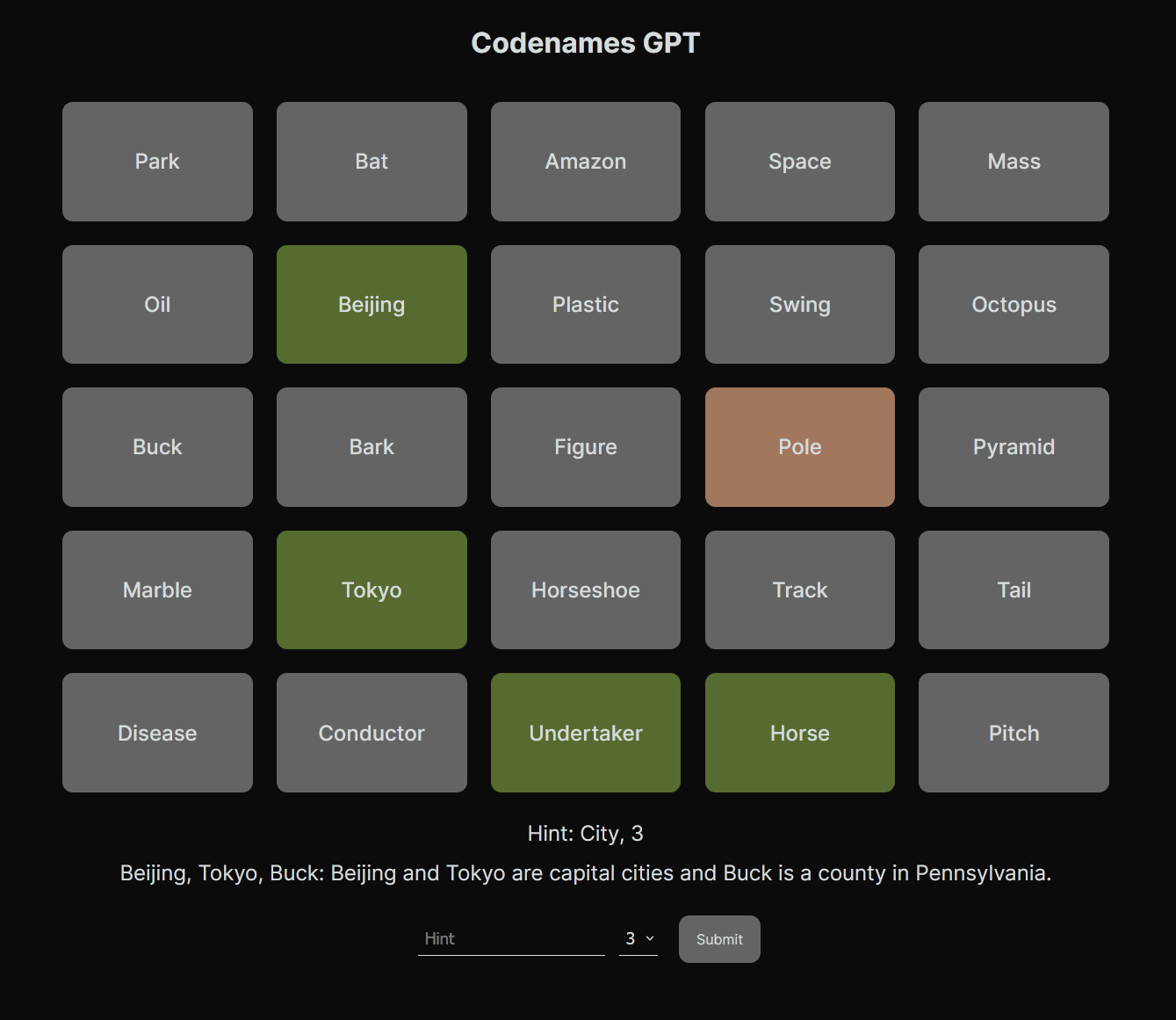 Codenames GPT is a simple word-guessing game based on the rules of Codenames Duet. The user plays cooperatively with the computer to guess the 15 hidden word...