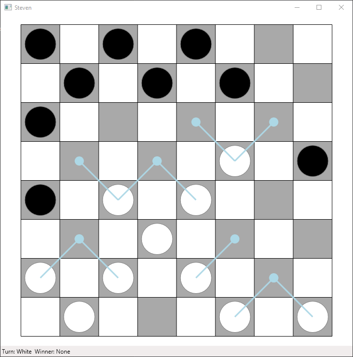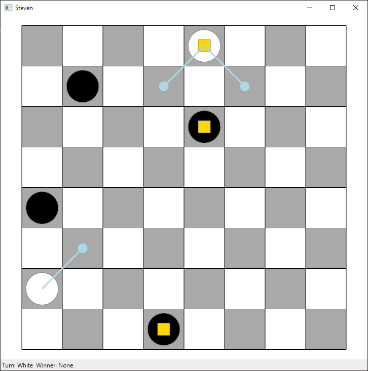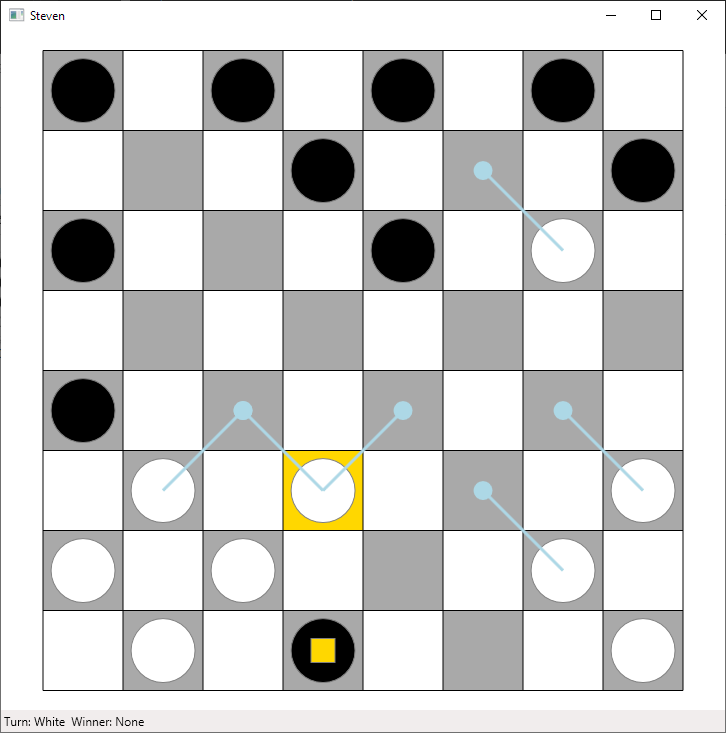 Checkers AI is a program which can play checkers against a human. It has a simple UI and an AI to play against named Steven. Kings are drawn with a yellow square representing the crown. The human player always plays as white.