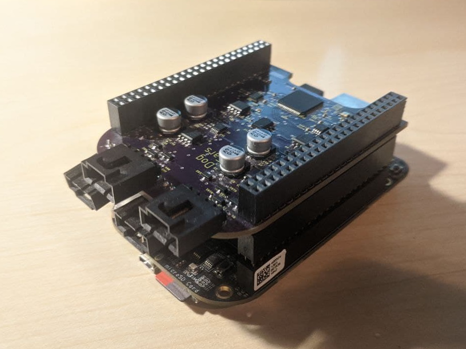 DogEars is a low-cost ADC for the BeagleBone designed for use in sonar applications. The hardware was designed by Steve Kahle and the software is written by Ethan Shea while at the Applied Physics Lab - UW. It can sample up to 4 channels at 144kHz/24bits. There are 4 selectable gain modes, and power can be delivered to active hydrophones. Samples can be acquired in real-time or captured. Applications using the DogEars driver can be written in C++ or python.
