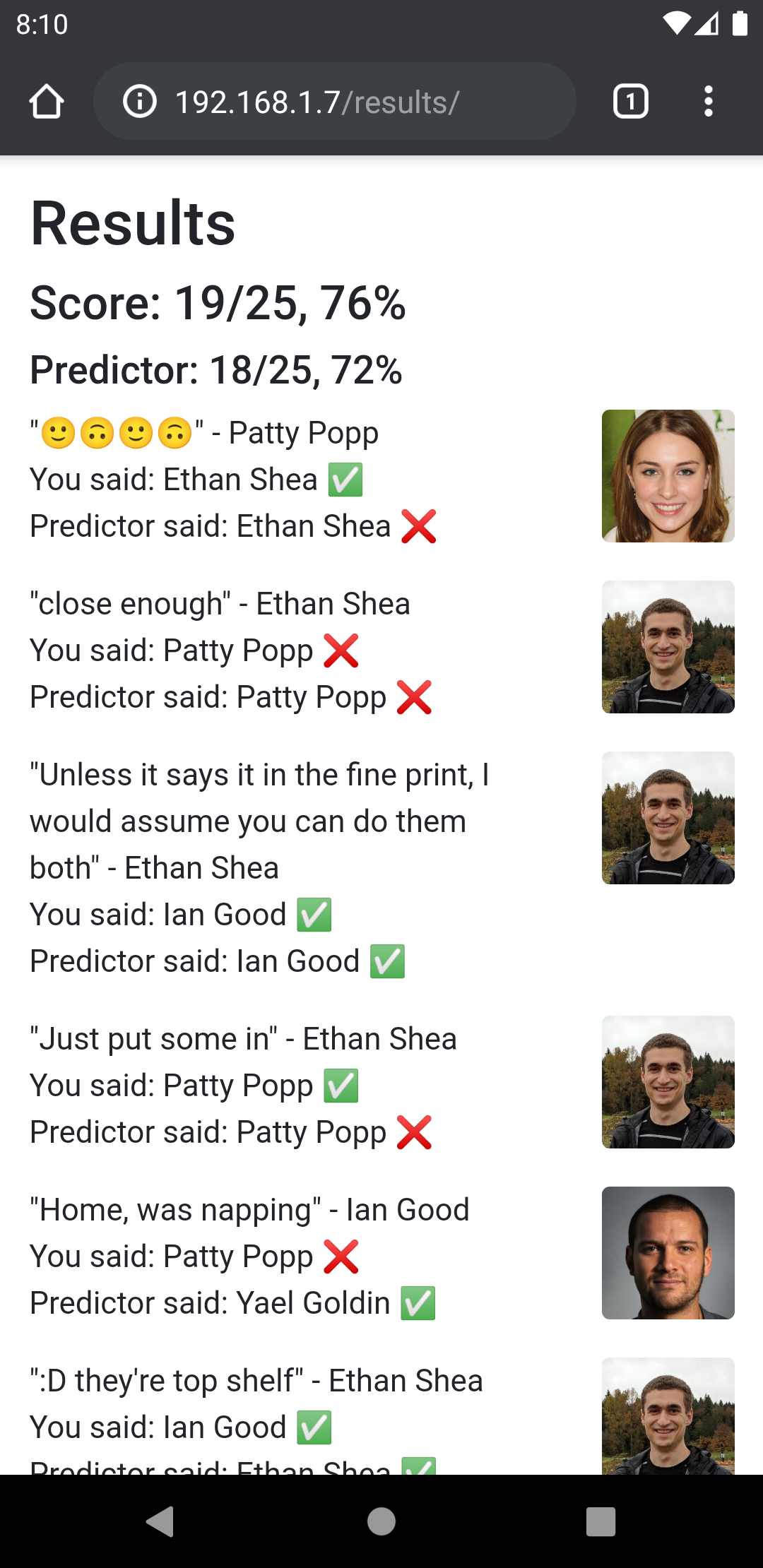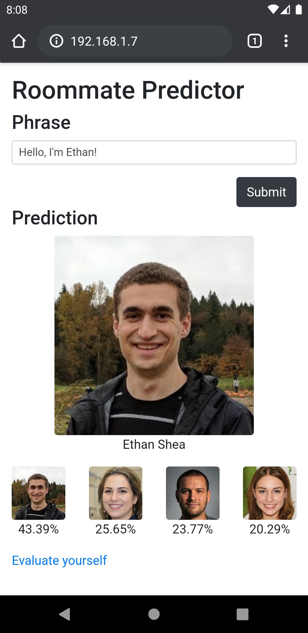Roommate Predictor is an AI which predicts the author of my roommate’s text messages. The application is served over the web and designed to be viewed on mobile devices. On the homepage, the user can enter a phrase and get the predicted author. Then, they can see a series of messages and test their ability to determine the authors. When they submit the test, their results are compared against the AIs. At this task, the AI performed about as well as my roommates, both with accuracies around 68%.